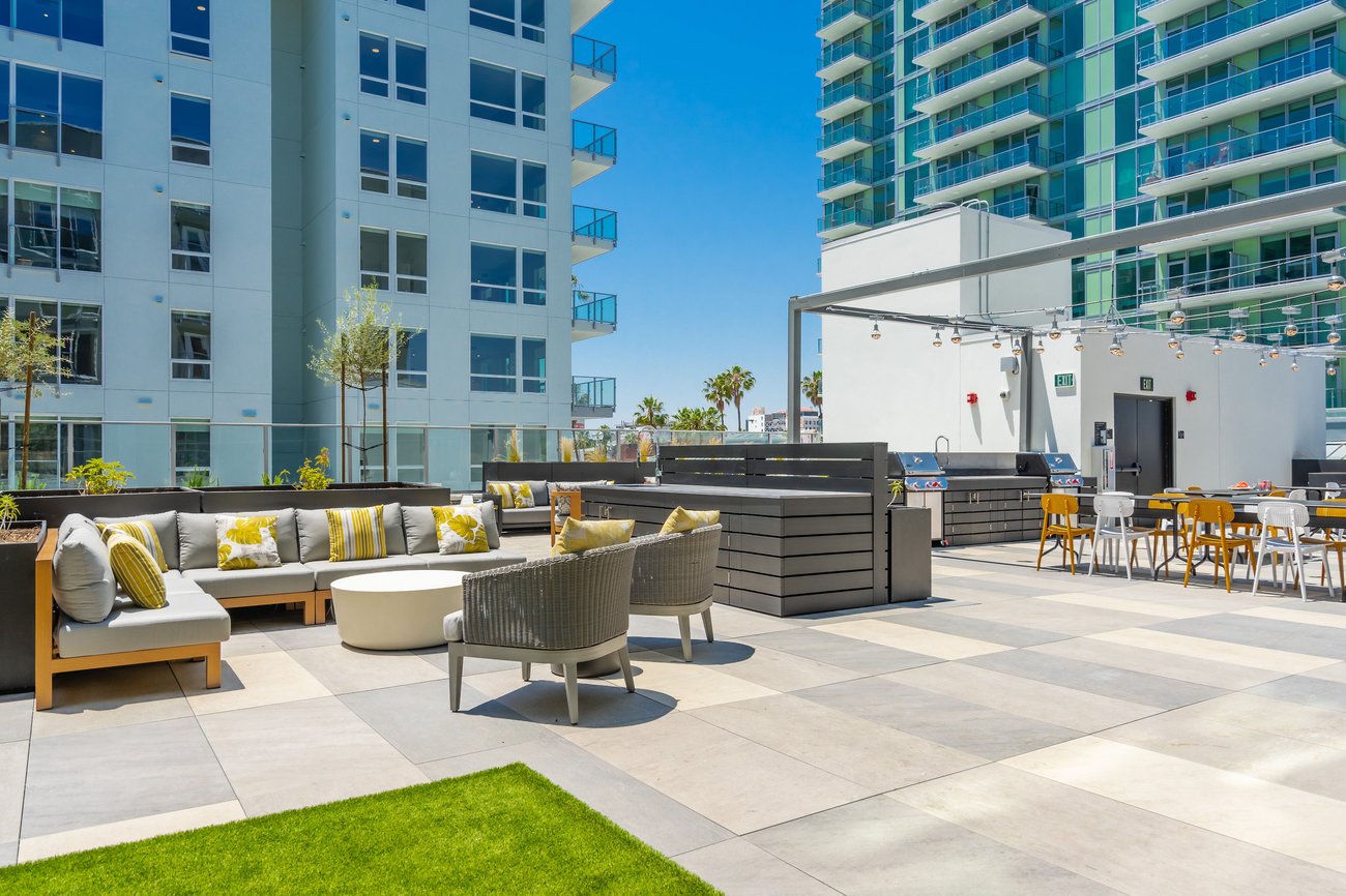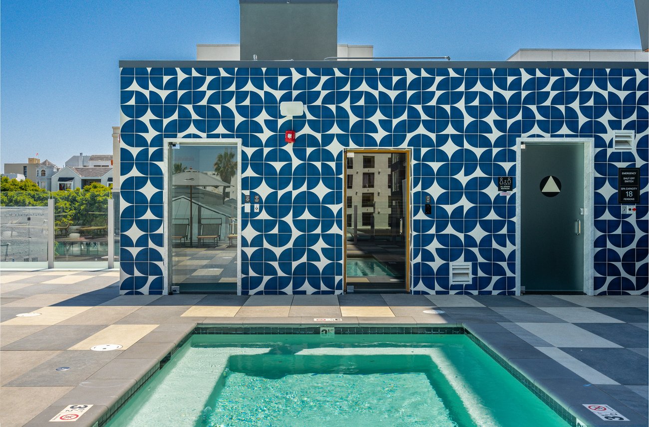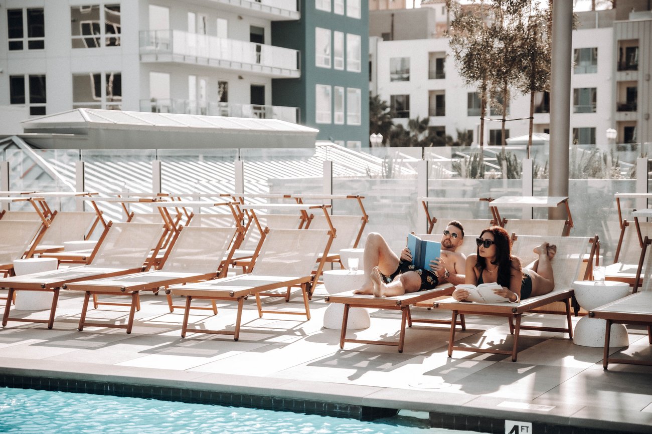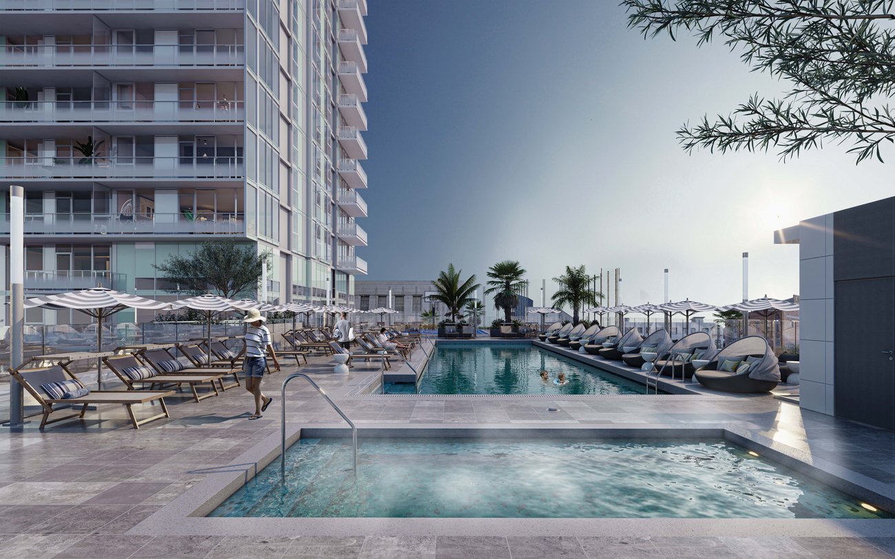A modern high-rise building stands behind a rooftop swimming pool surrounded by lounge chairs and city views under a clear blue sky.